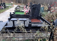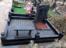 Завершающим этапом стала сборка оградки и укладка брусчатки. Ограждение мы создали из находившихся на могиле секций, кое где закрепив отломавшиеся навершия на разделительные столбики. Перед памятником мы установили гранитный цветник и две траурные урны, а по правую сторону от входа поставили заказанную клиентом лавочку, тоже изготовленную из чёрного гранита. Брусчатку мы замыли водой, одновременно удаляя всю строительную пыль, образовавшуюся в процессе работы.